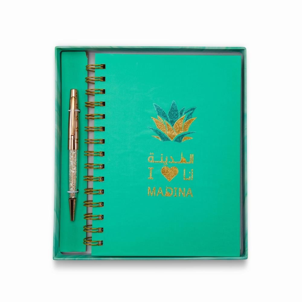 يتميز هذا الدفتر التذكاري بلونه الأخضر الجذاب وتفاصيله الذهبية التي تضفي عليه لمسة فاخرة. يأتي مع قلم أنيق مزين بتصميم "أنا أحب المدينة"، مما يجعله مثاليًا لتدوين الملاحظات أو كهدية تذكارية تعبر عن حب المدينة المقدسة. صنع من مواد عالية الجودة لضمان الاستخدام المريح وطول الأمد، ويعد هذا الطقم خيارًا مثاليًا للطلاب، الموظفين، أو لأي شخص يرغب في الاحتفاظ بذكرى جميلة من المدينة المنورة.