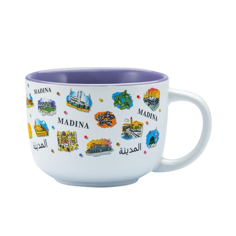 Enjoy your favorite drink with this large souvenir mug, beautifully decorated with colorful illustrations of Madina's iconic landmarks such as the Prophet's Mosque and other notable sites. Made from high-quality materials for durability, this mug combines Saudi heritage with a modern touch in its design. It’s perfect for daily use at home or in the office and makes a great gift for Madina lovers or collectors of Saudi memorabilia. The mug is comfortable to hold and offers a generous capacity for all your hot and cold beverages.